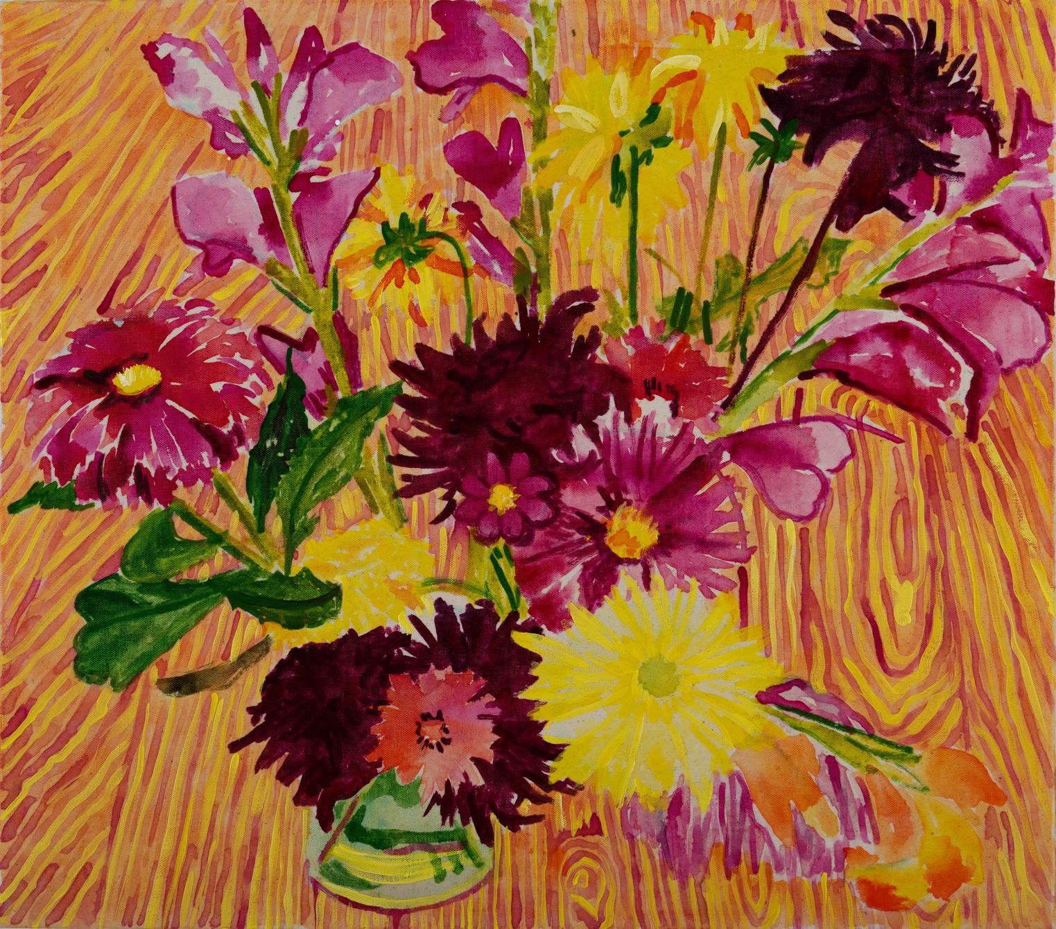 For Tucker Nichols, as well as being the springboard for an inventive use of color and pattern, the flower heals. Throughout the pandemic he donated hundreds of small flower paintings to anyone who was sick.