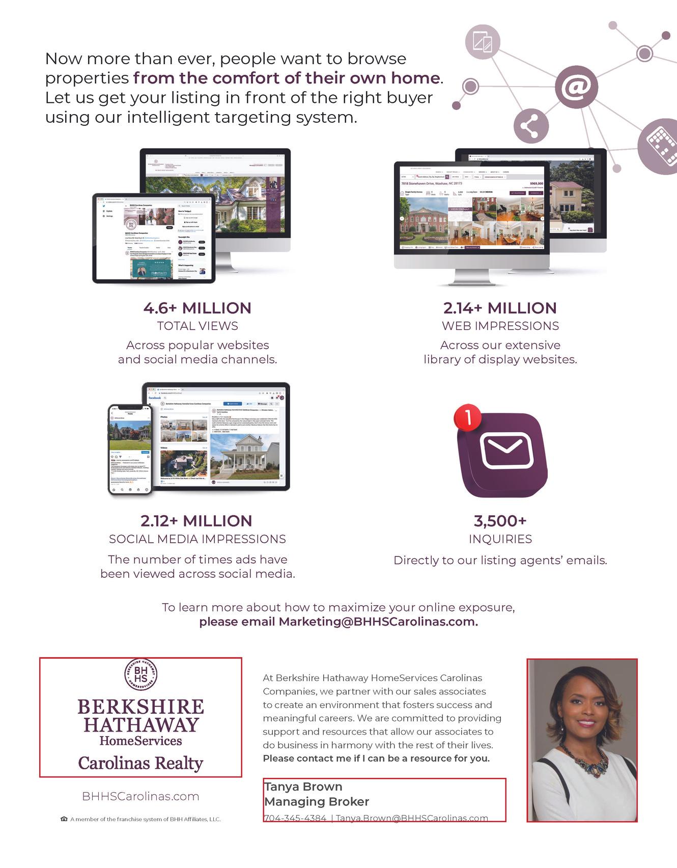 -345-4384 | Tanya.Brown@BHHSCarolinas.com BHHSCarolinas.com A member of the franchise system of BHH Affiliates, LLC. At Berkshire Hathaway HomeServices Carolinas Companies, we partner with our sales associates to create an environment that fosters success and meaningful careers. We are committed to providing support and resources that allow our associates to do business in harmony with the rest of their lives. Please contact me if I can be a resource for you.