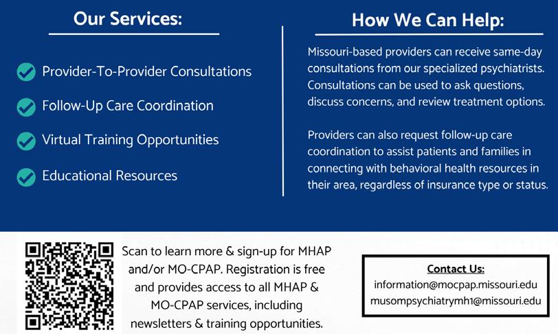 The Maternal Health Access Project (MHAP) & Missouri Child Psychiatry Access Project (MO-CPAP) offer no-cost programs to support Missouri’s healthcare providers in caring for perinatal & pediatric patients with mental and behavioral health concerns.