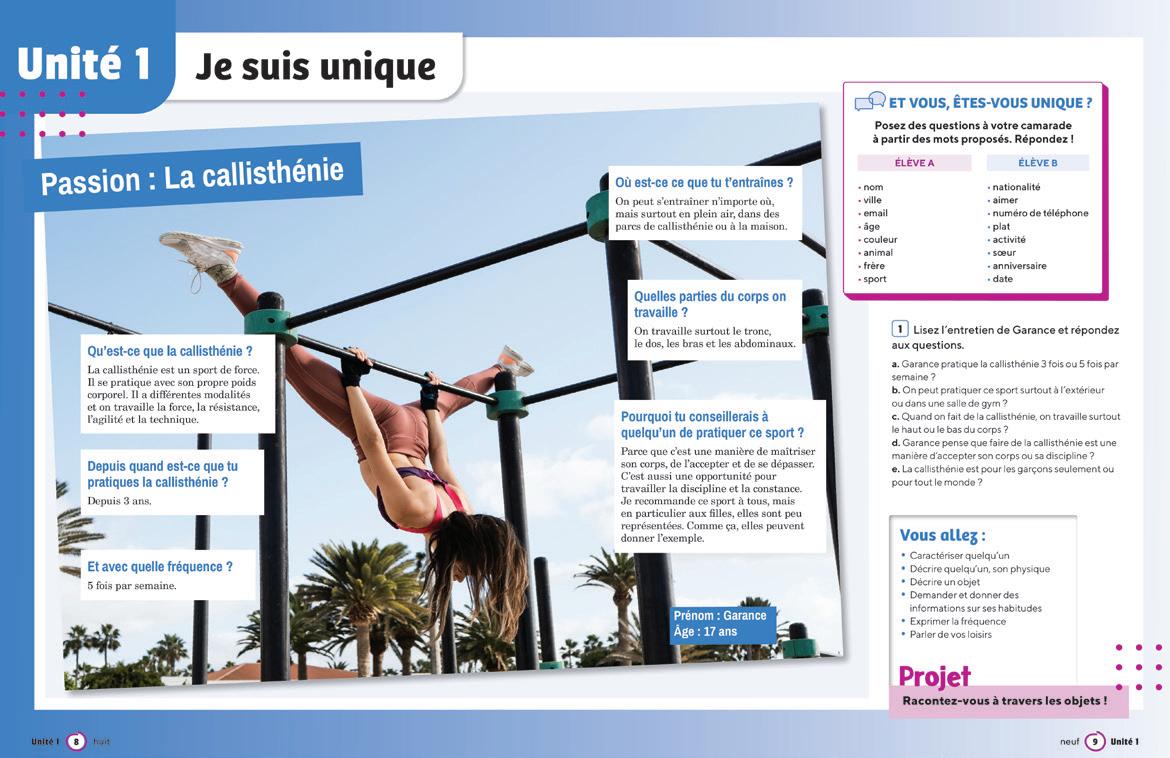 Le Livre de l’élève comprend 6 unités à l’approche variée afin d’éveiller l’intérêt de l’élève. Chaque unité intègre de nombreuses thématiques autour d’une notion centrale et se décline en 4 leçons qui permettent d’acquérir les compétences pour réaliser le projet de l’unité. La page « On révise ensemble » met en œuvre un travail collaboratif pour partager les connaissances de l’unité, consolider les apprentissages et vérifier que tout a été correctement acquis. Finalement, le bilan vient compléter l’unité et permet de valider l’acquisition des compétences. Dans les annexes, les entraînements au DELF proposent des épreuves afin de préparer les élèves aux examens de certification du niveau travaillé.