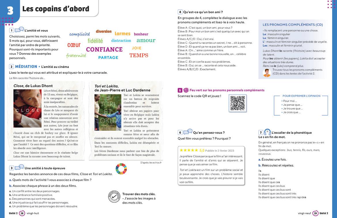 EN VRAI met l’accent sur la communication et notamment sur l’interaction orale, en tant qu’activité langagière au même titre que la production, la réception et la médiation. De nombreuses interactions, y compris des jeux et des activités ludiques, favorisent les échanges en binôme ou en groupe et rendent la méthode d’autant plus dynamique.