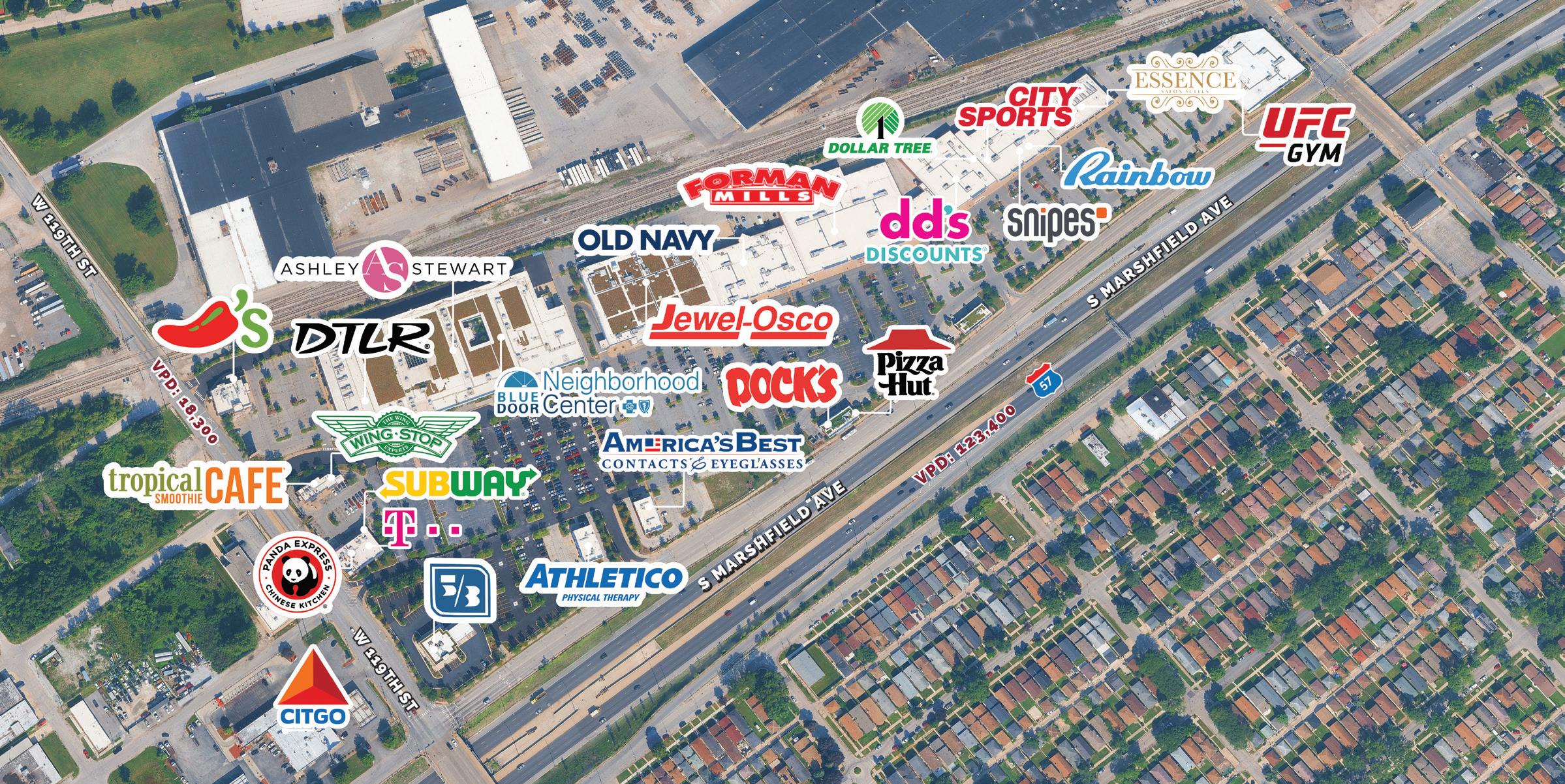 Marshfield Plaza is a 452,935 SF power center at the Interstate 57 and 119th Street interchange, giving storefronts and pylon signage daily exposure to 150,000 VPD. Anchors Jewel Osco, Old Navy, dd’s Discounts, and UFC Gym draw steady traffic.