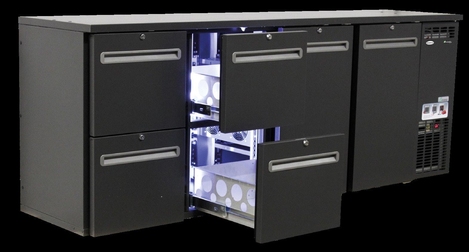 You can choose between standard 1, 2, 3 or 4 doors (length 77 cm, 124 cm, 172 cm or 220 cm, respectively), plug-ready or split (for remote condensing group). Instead of standard doors, glass doors, bottle rack with drawer and various drawer combinations can also be fitted. The cabinet will be delivered in the composition of your choice. The machine is completely removable so that quick servicing in the field is possible.