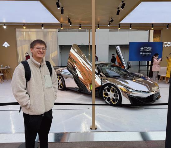 Travis is posing with: “A HiPhi electric supercar showcased in China, known for its cutting-edge design, dramatic upward-opening doors, and advanced EV technology representing the next generation of Chinese automotive innovation.”