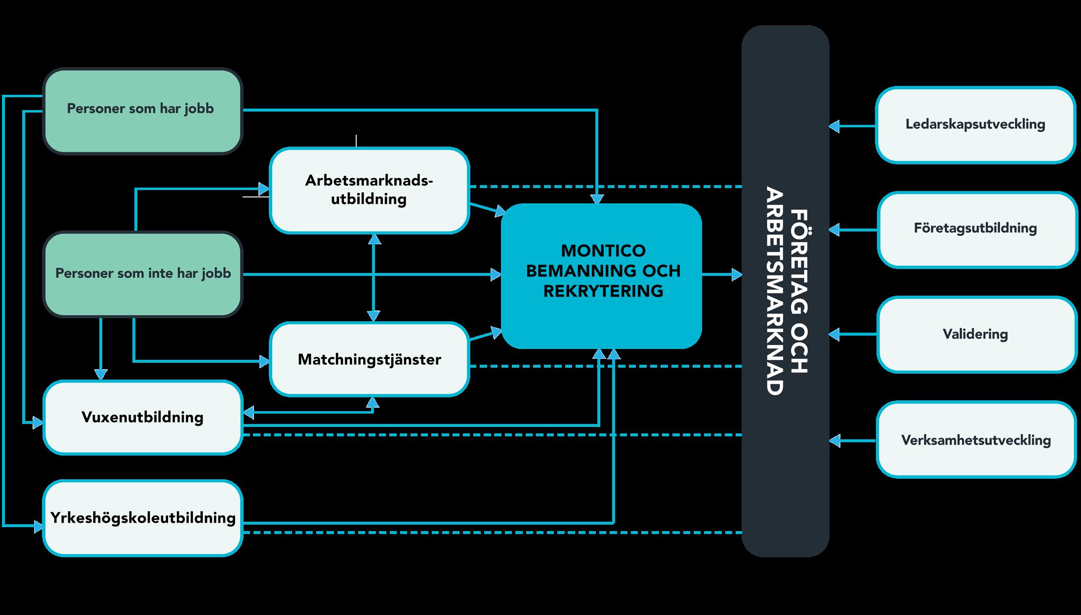 Montico gör kompetens till en framgångsfaktor genom att erbjuda attraktiva helhetslösningar till företag och individer som leder till effektiv och professionell matchning av rätt person med rätt arbete eller utbildning.
