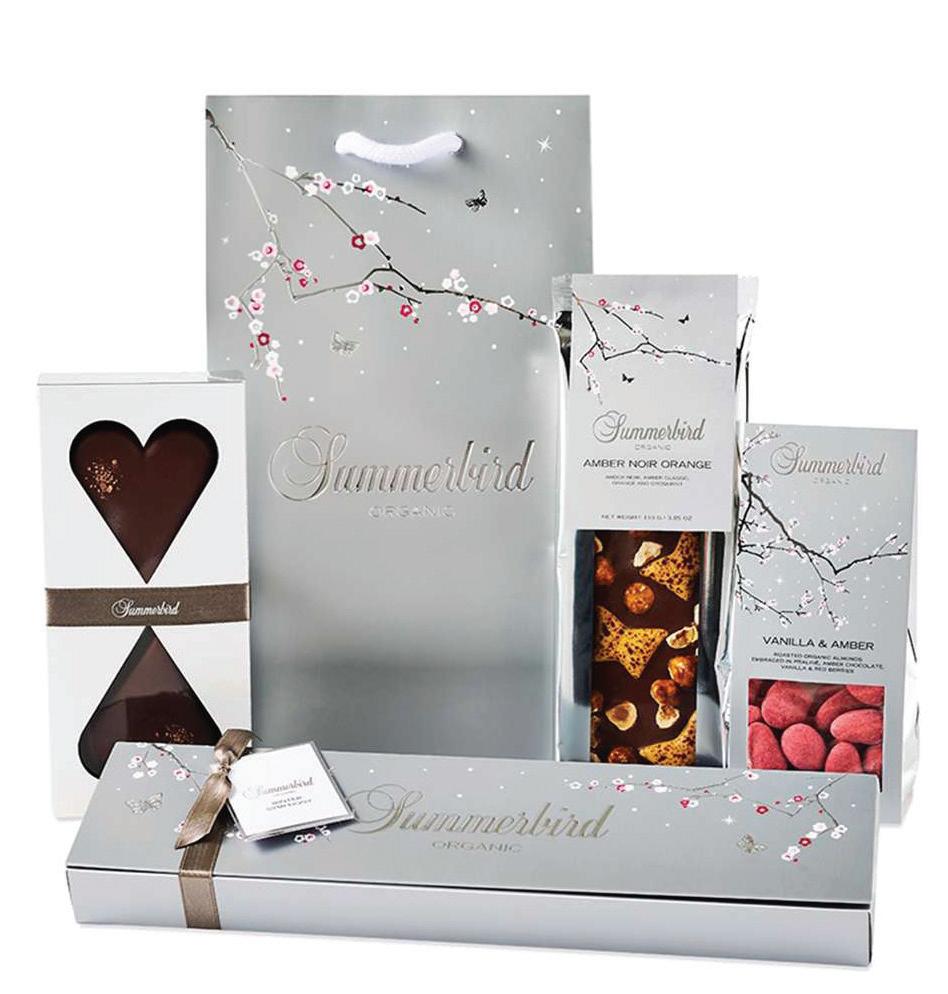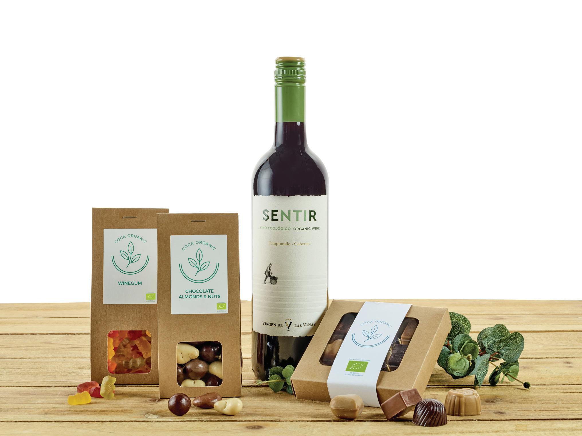 9 stk. Økologisk Luksuschokolade, 90 g. Økologiske blandede nødder & mandler m/chokolade, 100 g. Økologiske vingummibamser, 100 g. Økologisk Marshmallows m/chokolade, 100 g. Økologiske småkager m/quinoa & kakao, 80 g. Økologisk Arabica kaffe, 175 g.