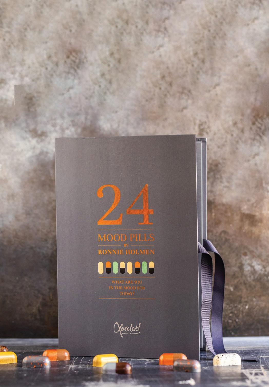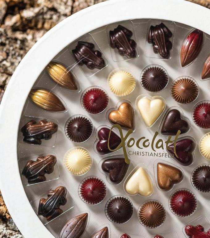 Fra xocolatl I Christiansfeld. Gaveæske med 16 fyldte chokolader med lakrids, nougat, saltkaramel, citron, XO-karamel, kokosganache, kirsebær, mint og marcipan med Grand Marnier.