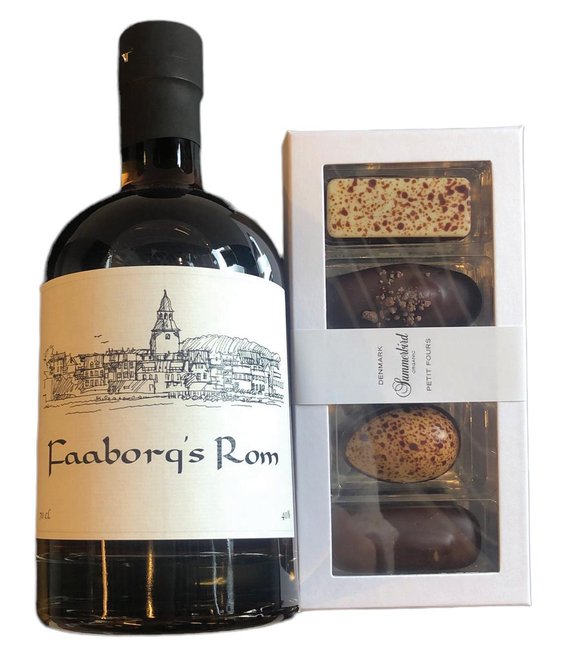 Gaven til de kolde aftener Faaborg’s Rom. 70 cl. og 1 æske Summerbird Petitfour med 4 stk. lækker chokolade