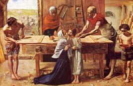 ham. Hun ved noget i sit hjerte, som de andre endnu ikke har forstået. Jesusbarnet sender sin velsignelse helt ud til beskueren på trods af afstand i tid og sted og på trods af sine unge år. Han er et barn. Men han går mod korset. Det er hans opgave. Hans sonoffer. Men indtil da blev han elsket, irettesat, skulet til, regnet med som en del af hverdagen på værkstedet.