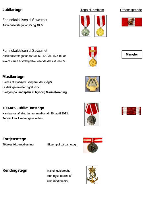 Når man modtager en medalje, tegn eller et emblem, er det et visuelt tegn for omverden at man har gjort sig fortjent til at opnå denne, og dette skal bæres med respekt. Derfor har vi i Danmarks Marineforening et sæt regler som beskriver hvordan vi bære disse. Først en oversigt på hvilken Emblem er & Tegn vi har i Danmarks Marineforening: