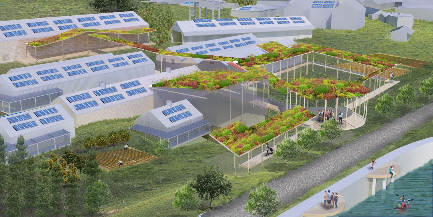 Les images présentées ont été produites pour Communitecture et l’équipe P+SET. P+SET (Permaculture + Social Equity) est l’un des 10 finalistes du défi Resilient by Design Bay Area Challenge. La proposition holistique de Communitecture pour Mare Island est un Parc Régional des Ressources. Le projet comprend un Village de Soutien et d’Équité, un Village des Arts et de l’Écologie, un Campus d’Éducation en Plein Air, une Ferme d’Énergie et de Nourriture de 172 acres, ainsi qu’un Centre de Préservation du Patrimoine et d’Interprétation, et la réutilisation adaptative d’une Base Navale.