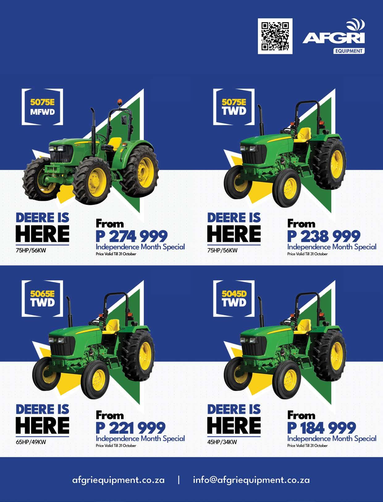 In the spirit of Botswana's Independence Day on the 30th of September, our AFGRI Equipment Botswana team is still running an Independence Month Special on the John Deere 5075E MFWD, 5075E TWD, 5065E TWD, and 5045D TWD.