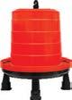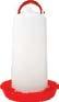 Water is provided by gravitation from tanks to either saucer drinkers for the day-olds, or drinkers suspended from the roof of which the height can be adjusted as the chickens grow.