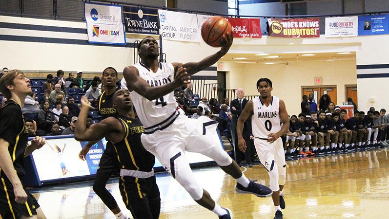 Daniel Spencer drives to the basket in a home contest against the Pfeiffer Falcons. Spencer averaged 14.8 points per game.