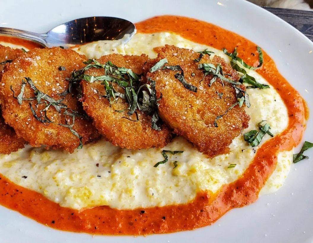 Tupelo Honey|Facebook Perfectly fried green tomatoes on grits. The restaurant is located at 4501 Main St. Virginia Beach, Va.