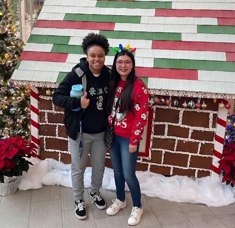 Lily Reslink|Marlin Chronicle Sophomores Abigail Villacrusis and Sydnee Washington pose in front of a gingerbread house.
