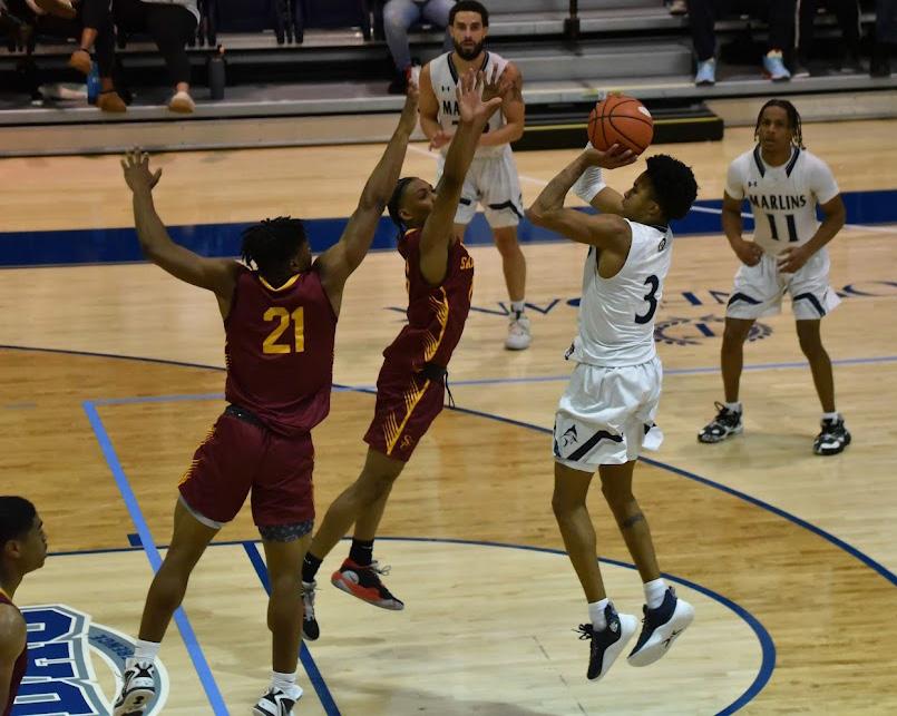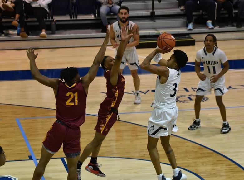 Junior Omari Deveaux maneuvers a shot over two defenders in a game against Salisbury University on Friday, Nov. 10 in the Townebank Tipoff Tournament.