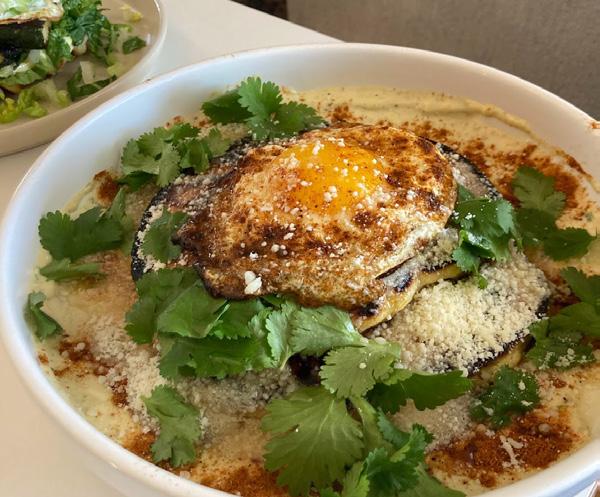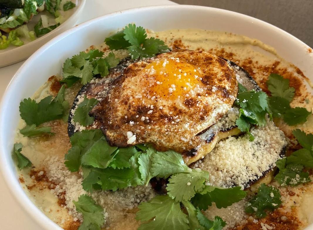 Mea Culpa Cafe servesvarious plates, inclusing a savory corn pancakes with a runny egg and cilantro.