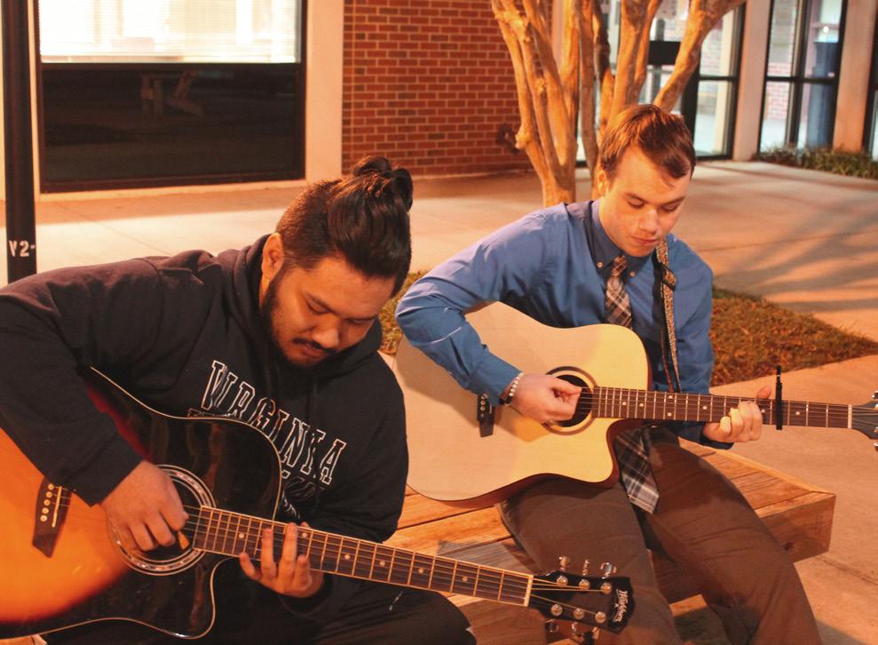 Layne Nooner| Marlin Chronicle Robins and Gador rehearse chords together outside the caf.