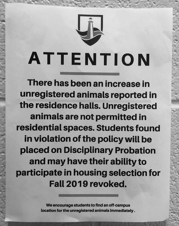 There has been a rise of unregistered animals on the Virginia Wesleyan University campus, and these violations can cost students their housing selection. Students can register either service animals or companion animals. Recently, there have been notes posted around campus reminding students that if they have a pet on campus to make sure that they are registered and are allowed to be here. Residence Life is starting to crack down on these violations.
