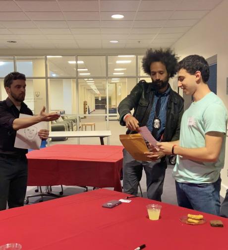 The event began with attendees being greeted with a nametag of a celebrity that they will act like for the remainder of the night. There was roughly 10 minutes of mingling and eating hors d’oeuvres. The action began sharply with a scream and “detectives” running into the room who were yelling at people to put their hands up. The detectives announced that there has been a murder. They proclaimed that Kylie Jenner was the one murdered.