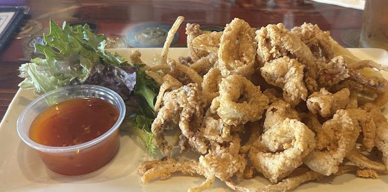 bar food, the menu had a noticeable influence of home-cooked meals, offering dishes that felt a step above what you might expect. That said, the classics were still there, giving the menu a familiar foundation. Some of the items include the calamari, which arrived hot and crispy and went well with the Thai chili sauce. The bourbon chicken stood out as a clear favorite, offering a balance of sweetness and savoriness that felt both comforting and carefully prepared. The Warriors Craft Burger also delivered, with first-time patron Logan Cotterell describing it as “a top-ten burger I’ve had around here. Bacon jam is something I never knew I needed in my life.”