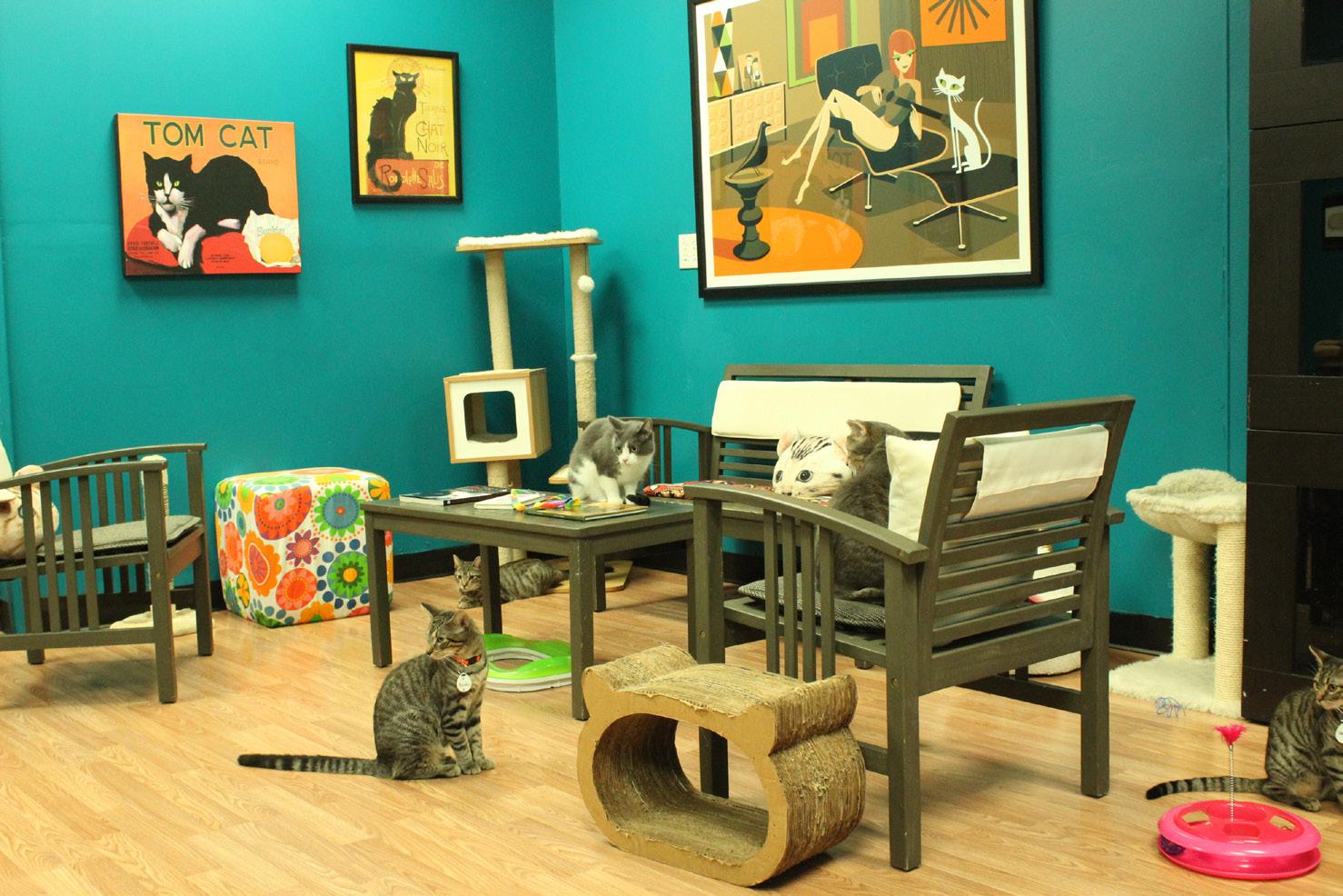 The Catnip Cat Cafe provides seating and toys for guests to interact with the cats.
