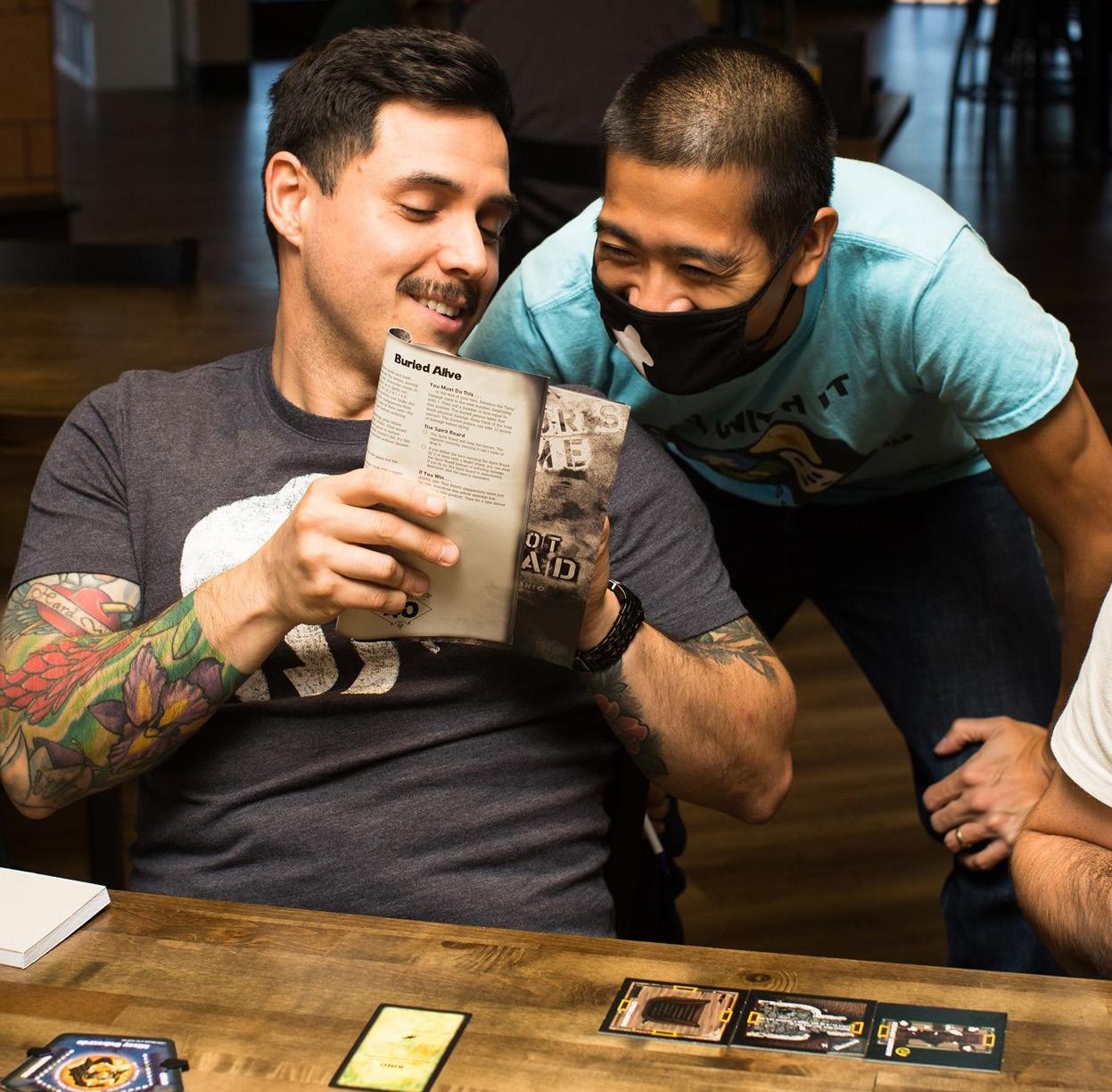 Owner Quan Truong with a patron at the grand premiere of his establishment, the board game library with over