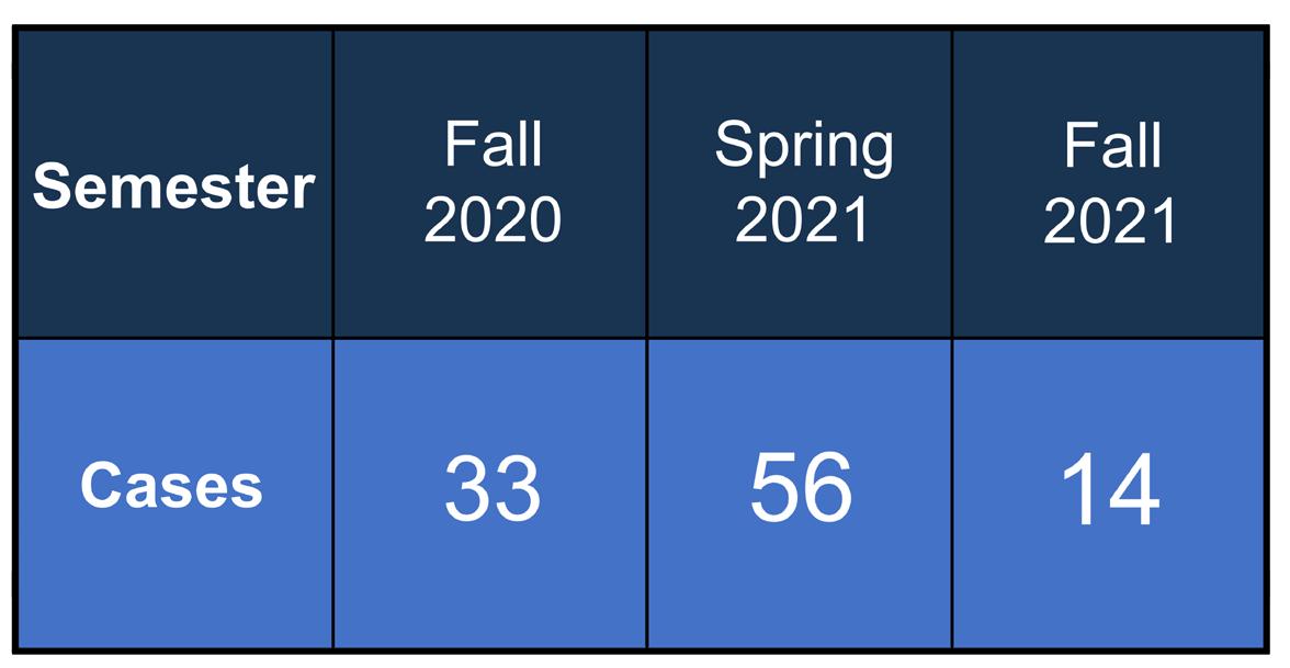 Dr. Keith Moore, vice president for campus life and operational management and appointed campus COVID-19 coordinator, said, “I think things have been going exceptionally well.” For the Fall 2021 semester, there have been 14 cumulative COVID-19 cases. This is a sharp decrease from the approximately 50 cases from the last two semesters. He noted that this was in line with the surges occurring at those times. He nodded to last year’s mitigation efforts as being “exemplary” and even the “best in the state” upon meeting with other colleges throughout the Commonwealth.