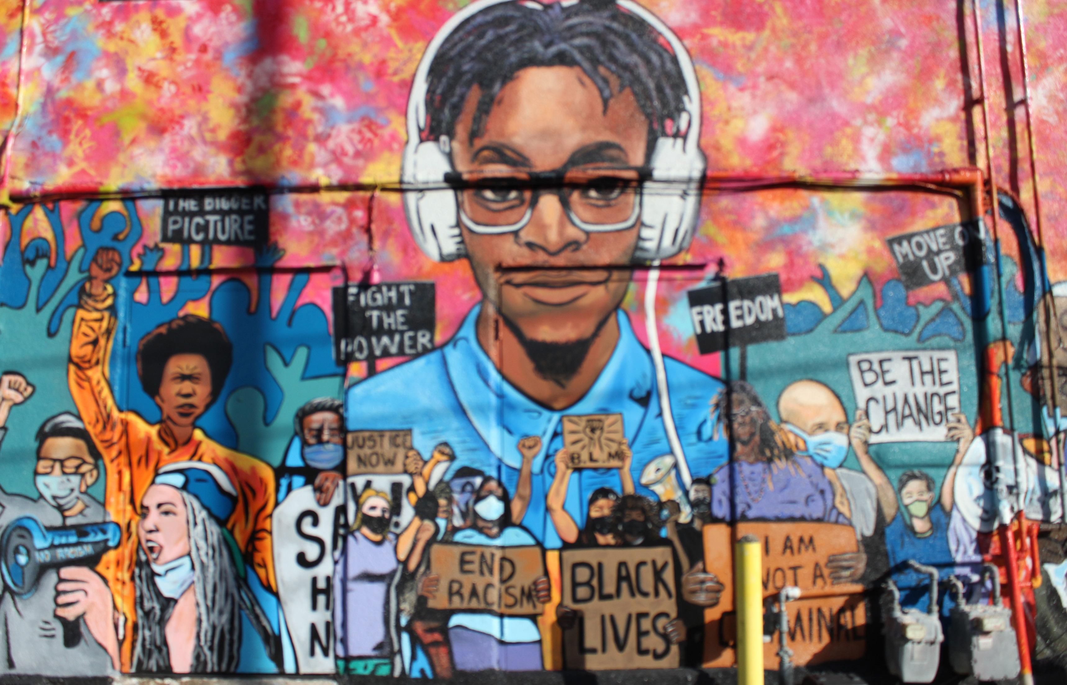 Swirls of all sorts of bold and vibrant colors stood out in the alleyway. Emblazoned with paint, people wore face masks, held protest signs saying ‘justice now,’ ‘be the change’ and ‘end racism’ while others carried speakers all along the wall.