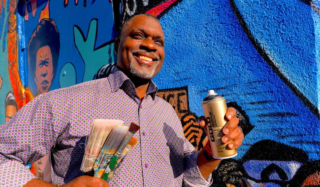 Artist Clayton Singleton poses proudly with his paint and brushes.