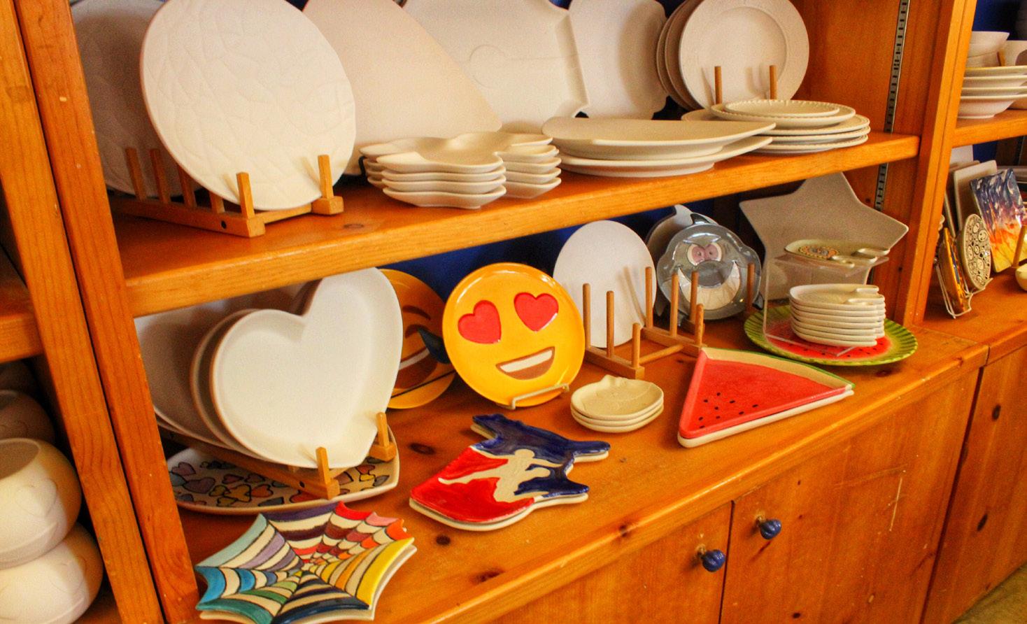 Assorted white ceramics sit arranged on the shelves like blank canvases. There were cookie jars, mugs, picture frames and more varieties of decorative ceramics to choose among them. The painted ceramic pieces on the shelves with designs of characters and vivid colors sparked creative ideas.