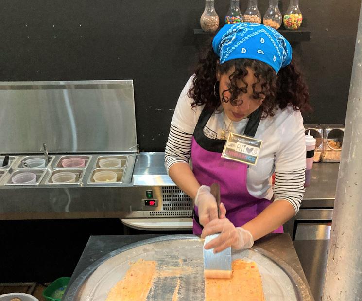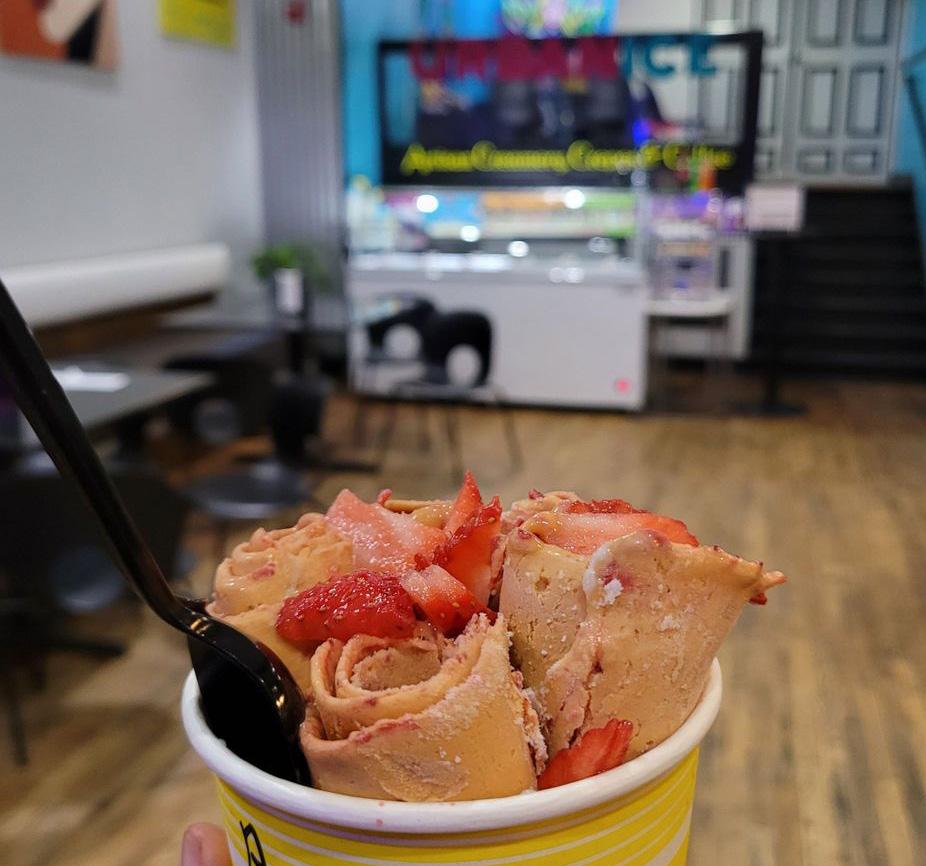 Their extensive menu easily caters to bold and conservative taste buds. A serving of rolled ice cream can be made vegan or dairybased, with flavors from vanilla to saffron. Mixed in and on top, a customer can choose as many of their fruity, crunchy or decadent fixings for one set cost.