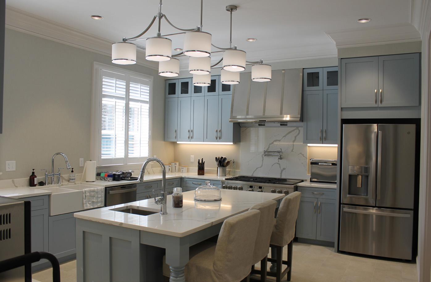 Just off the East Room is the terrace and windowed tent. Another door leads from the terrace to the entrance to the kitchen. With gleaming quartz countertops and sky blue cabinets, the kitchen is designed to accommodate a family or a catering team.