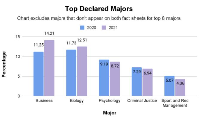 Despite the changes in specific areas, the university as a whole has kept Business, Biology and Psychology as the top three declared majors. During the Fall 2021 semester, Business accounted for 14.21% of declared majors, Biology for 12.51% and Psychology for 8.72%.