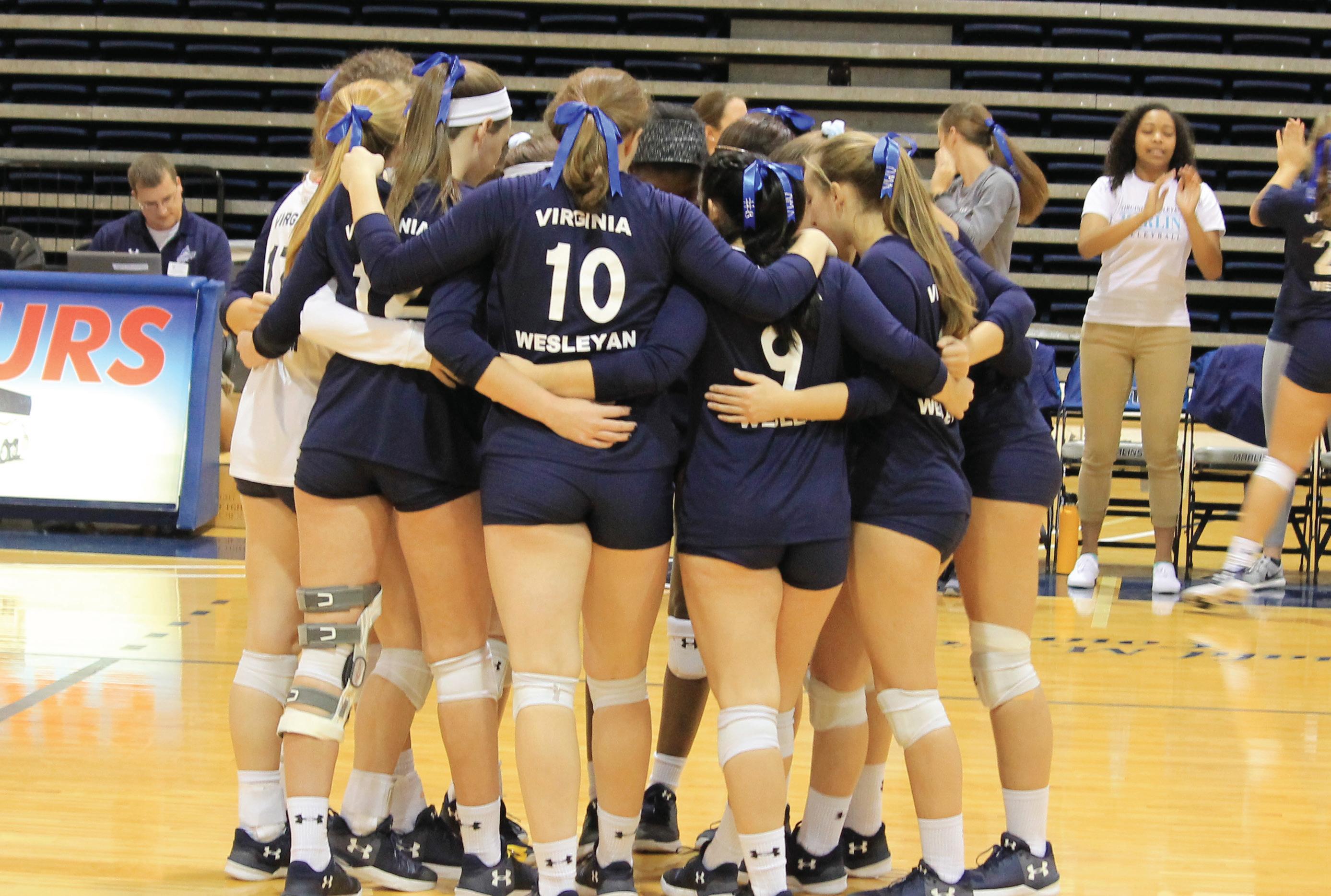 The Virginia Wesleyan volleyball team huddles on the court before their first round match-up against Roanoke.