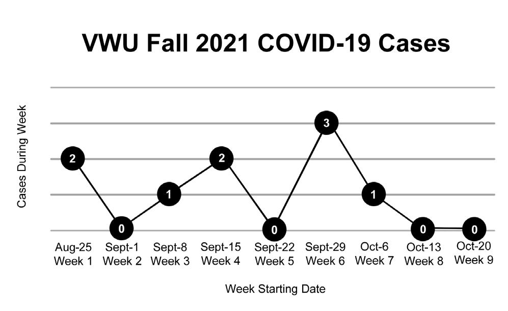 Virginia Beach Department of Health recommendations to help shape guidelines on campus. In the event of another spike in cases, Moore states that VWU is prepared to add more precautions, up to and including remote instruction. However, students and staff alike have expressed their dislike of remote instruction, so Moore hopes the downward trend continues so life can return to “the safest normal possible on campus.”