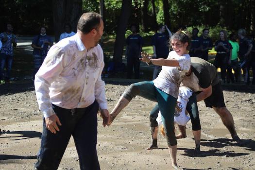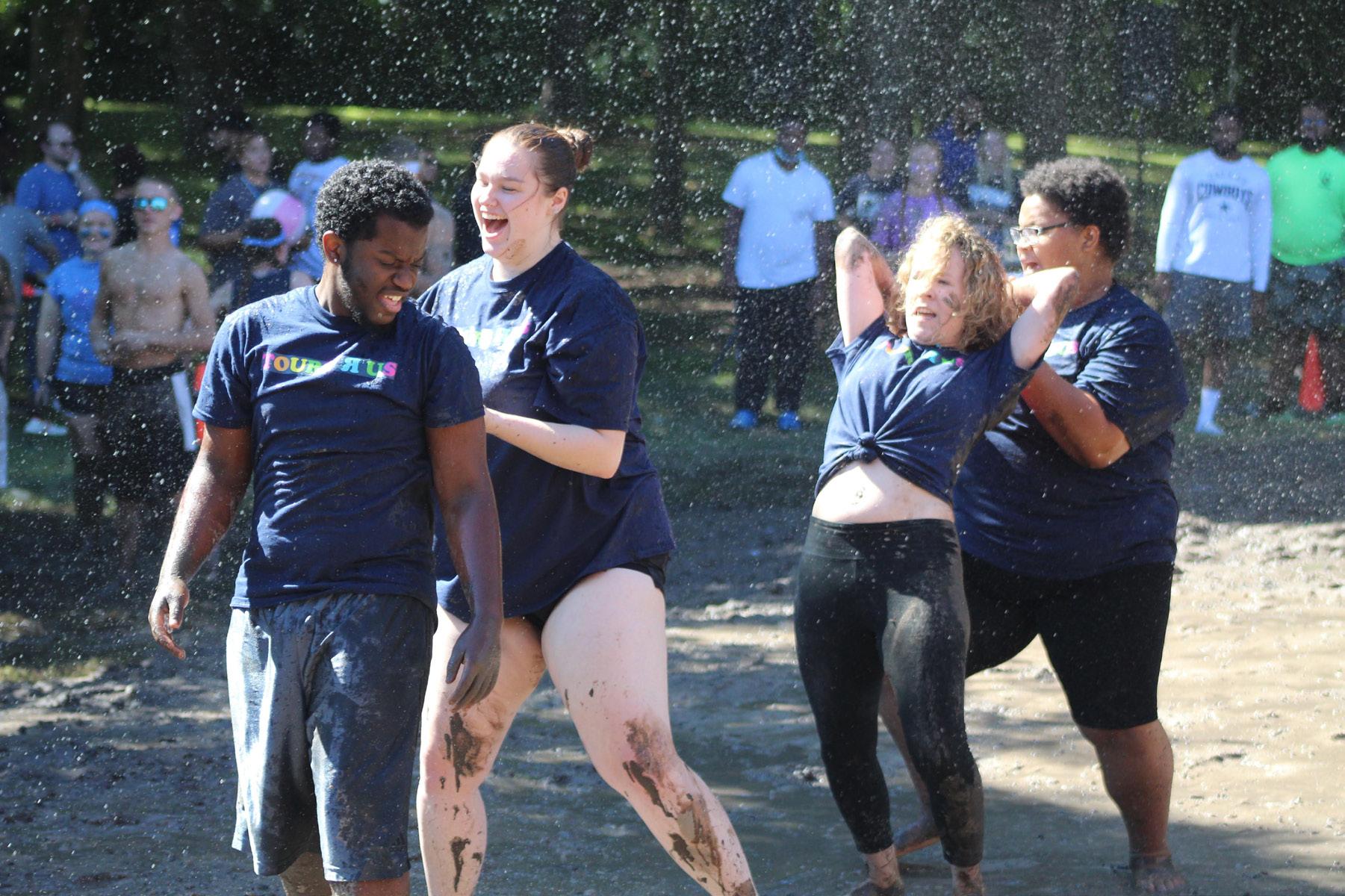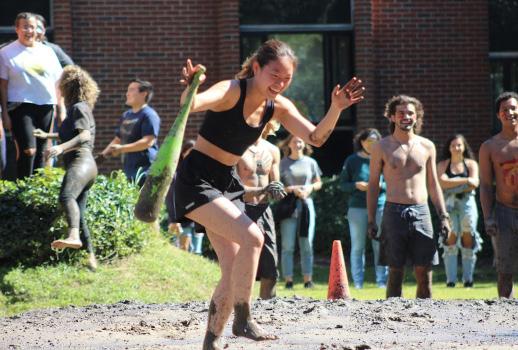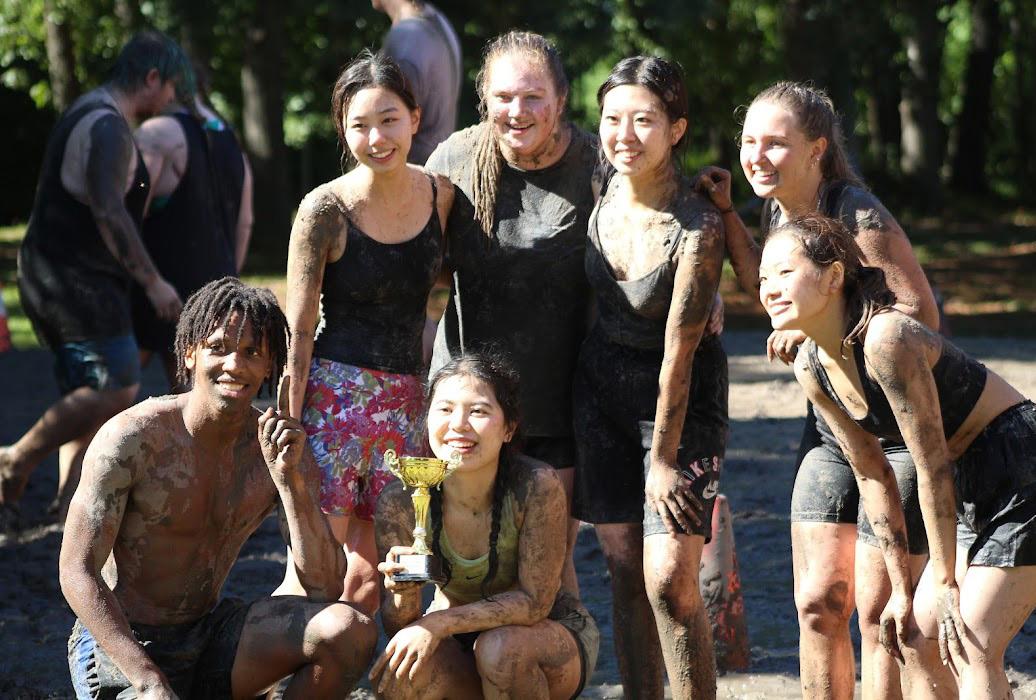 Virginia Wesleyan University held the traditional mud games event Sept. 24 at Rose Lawn on campus. Both students and staff formed teams to compete for first place as they engaged in relay races in the mud. The winners received an award of $250. Team Dwarves placed first. This team consisted of seven members including junior Moeno Sawai and junior Risa Yanagita, who are both foreign exchange students. Since this was their first time participating in mud games, they did not expect to place a winning position. “We were very surprised. We are really glad to be winners,” said Sawai. This event consisted of several games that included dizzy bat, egg walk and crab walking through the mud. Teams won individual races as they completed these tasks faster than their opposing teams. “I have never gotten dirty like we got in the game before, so it was really fun and exciting,” said Yanagita.