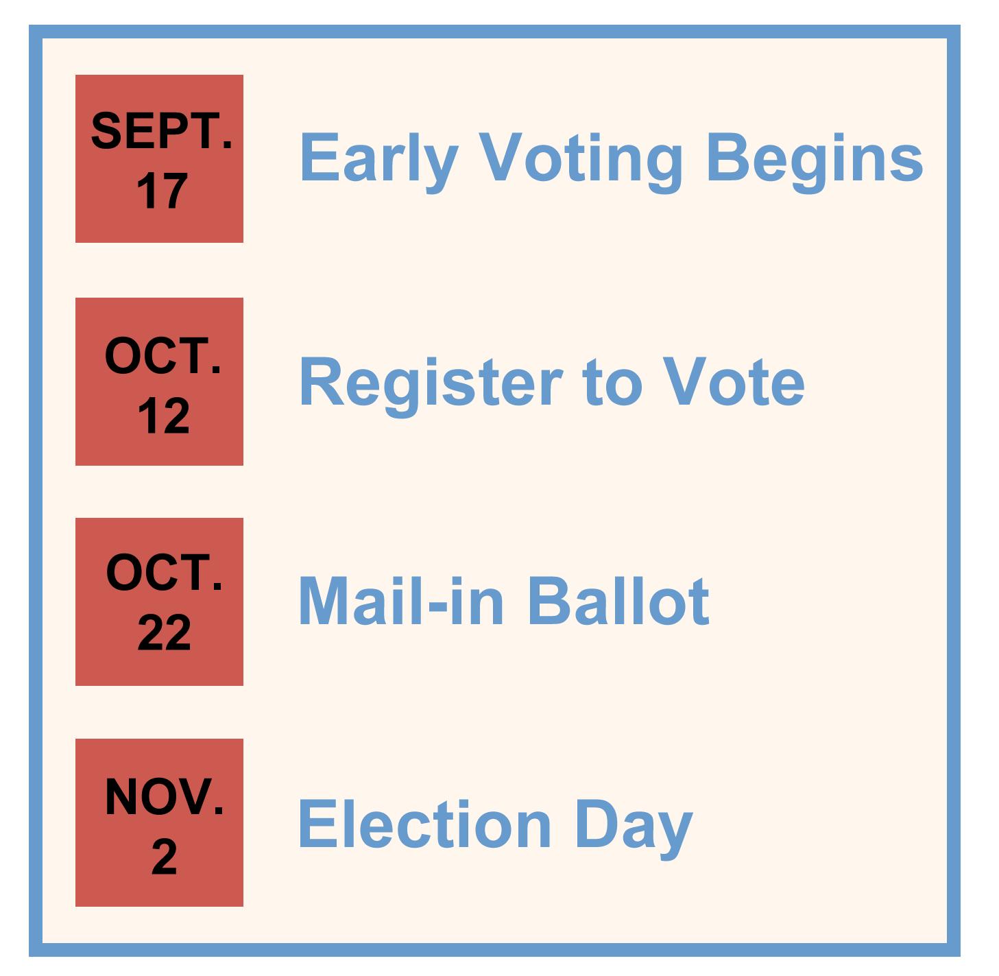 To vote in Virginia, one must be a resident, but out-of-state students can still register to vote using their campus address. The deadline for voting registration is Oct. 12. Residents of Virginia can register to vote at https:// www.elections.virginia.gov/. This includes a portal to register to vote, check your registration status, find your polling place and apply to vote absentee by mail. A mail-in ballot must be applied for by Oct. 22 in order to be counted. Those voting in-person can vote at the Ebenezer Baptist Church at 965 Baker Rd in Virginia Beach or early in-person at the Virginia Beach Voter & Elections Office at the Municipal Center.