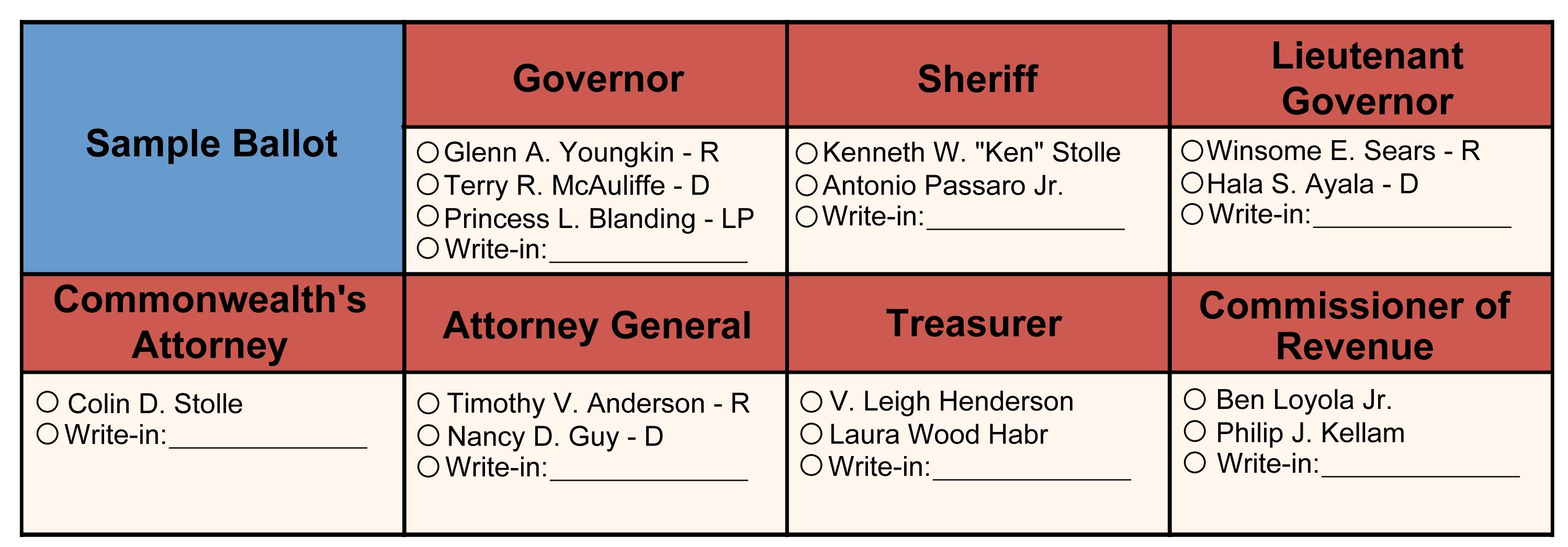 Running for lieutenant governor is Hala S. Ayala with the Democratic Party and Winsome E. Sears with the Republican Party. Ayala represents the 51st District in the House of Delegates while Sears is a former Delegate who represented the 90th District from 2002-2004. More details on Sears’s campaign can be found at winsomesears.com, and Ayala’s website is located at halaforvirginia.com.