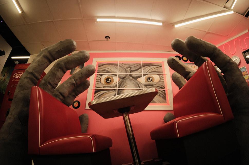 Inside the second room lies a mind-bending optical illusion, complete with a lopsided diner table and a large pair of menacing hands protruding from the wall. The room also includes a puzzle to find the door to the next room, which is a great opportunity for groups to put their heads together to solve a problem.