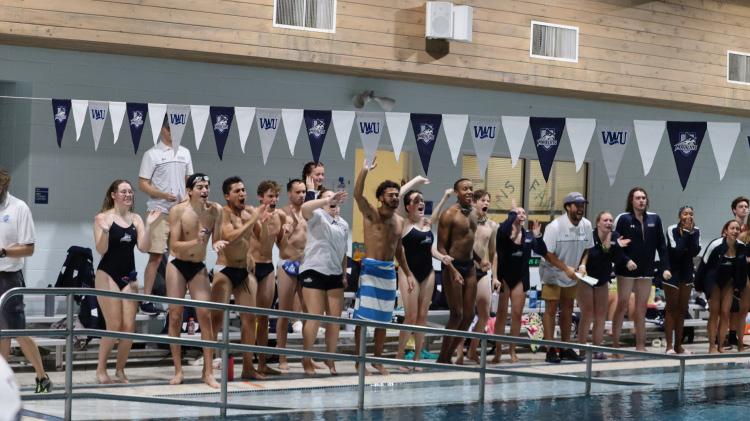 Virginia Wesleyan Men’s and Women’s Swimming team cheer on their fellow teammates at the Batten Center natatorium.