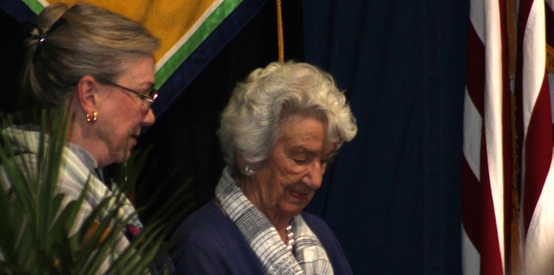 Jane Batten and Chair of the Board of Trustees Nancy T. DeFord during a prayer at the State of the University on Aug. 20.