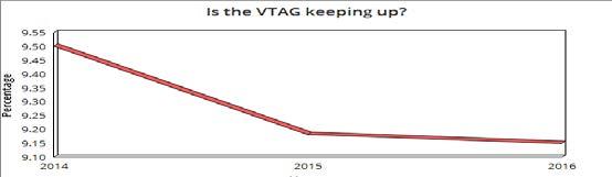 Additionally, according to data provided by senior researcher and policy analyst Donald Stauffer, the number of students at VWC receiving the Virginia Tuition Assistance Grant has gradually decreased. This year, VWC currently has 962 full-time, in-state residents but only 838 of them are VTAG recipients. In 2015, the school had 904 VTAG recipients. In 2014, there were 916 VTAG recipients. The current tuition cost for Virginia Wesleyan College students is $34,960. Students eligible for VTAG are currently awarded $3,200. The 2015 cost of tuition at VWC was $33,778, with eligible students being granted $3,100 through VTAG. In 2014, the cost of tuition at VWC was $32,636. Students were awarded $3,100 through VTAG.