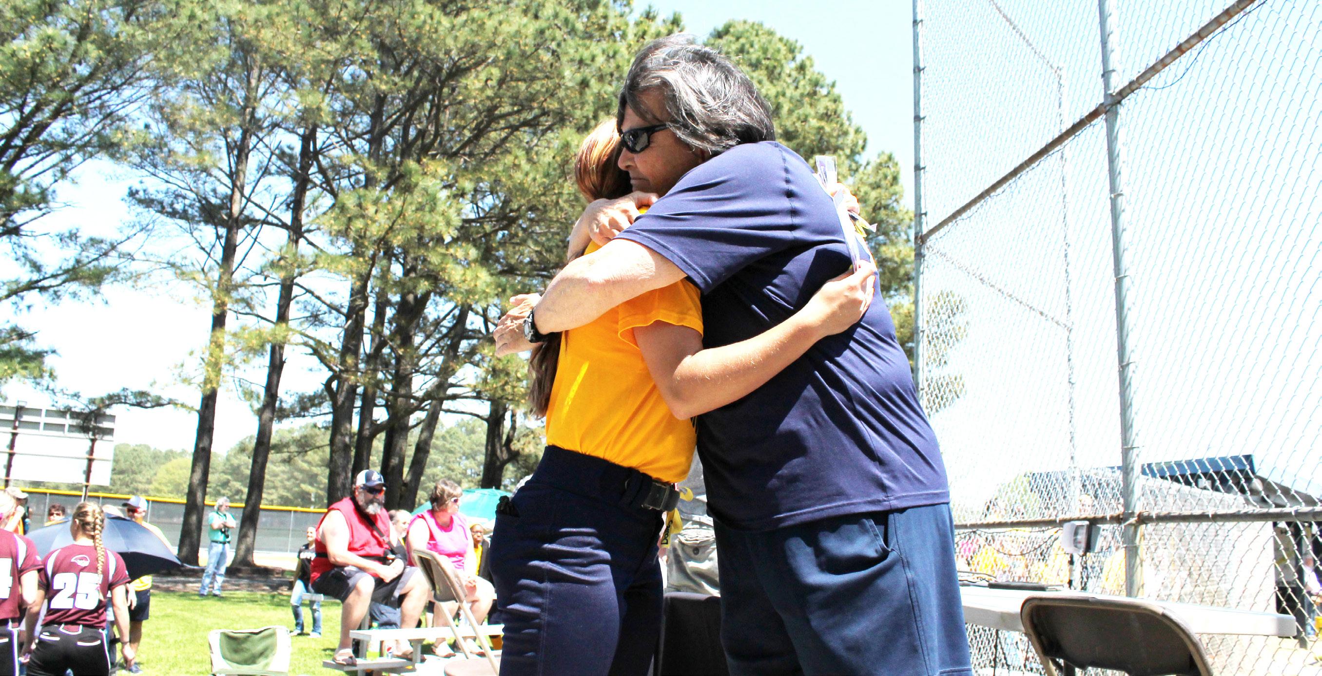 Joanne Renn, VWC’s althethic director, and Kayla Malkos, junior softball player, embrace during VWC’s annual Strike Out Cancer game on Saturday, April 18.