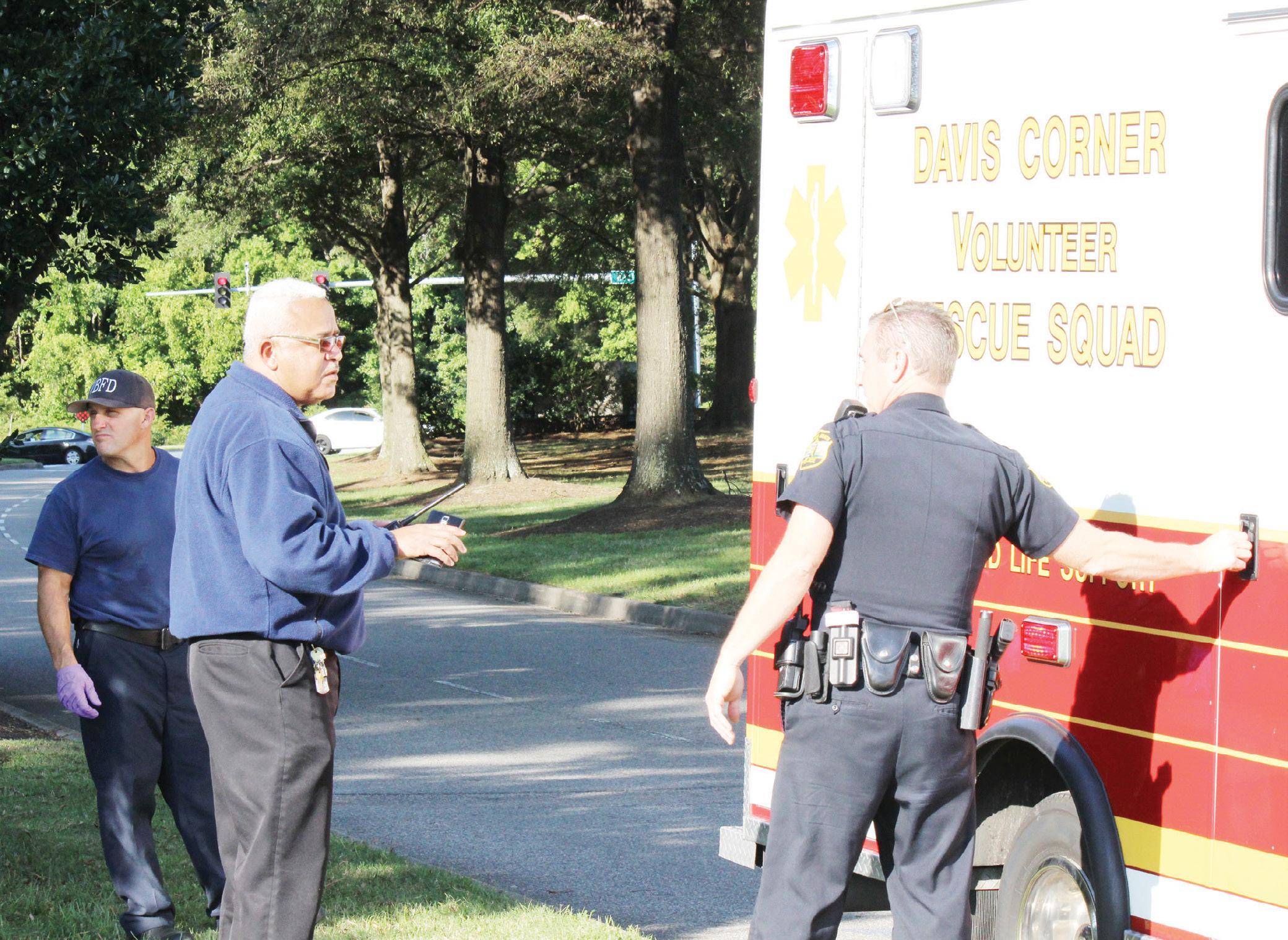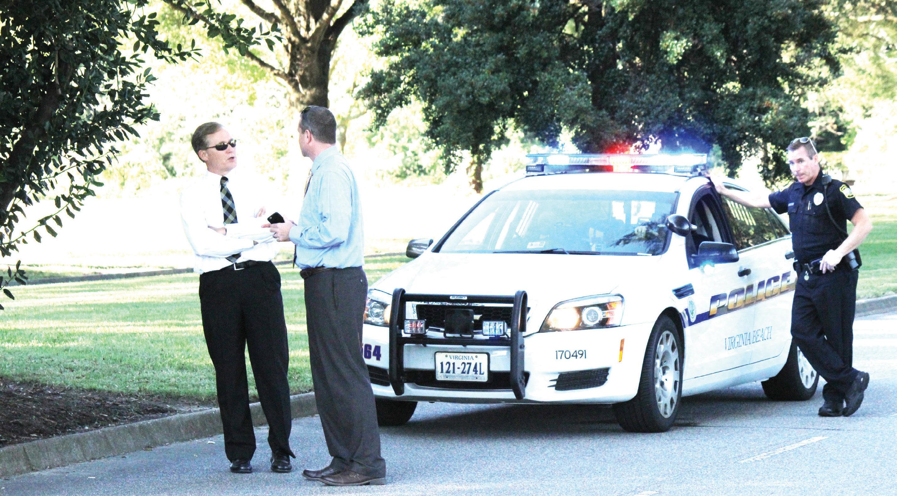 President Scott Miller, left, and Dean of Students Keith Moore, center, discuss the details of the hit-and-run at the campus entrance as a Virginia Beach policeman waits.
