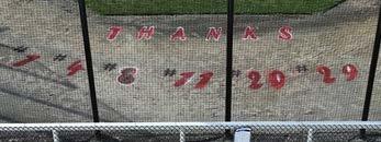 The numbers of all the baseball seniors painted on the back stop.