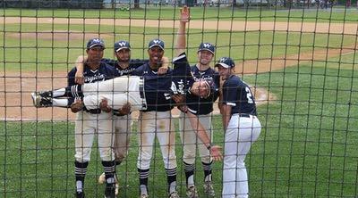 From L to R: Taylor Erby, CJ Lindsay, Justin Erby, Pat Barrett, Riley Koonce. Lying sideways: Austin Gammon. Baseball seniors pose in front of the backstop before taking the field against Emory and Henry on Saturday, April 22.
