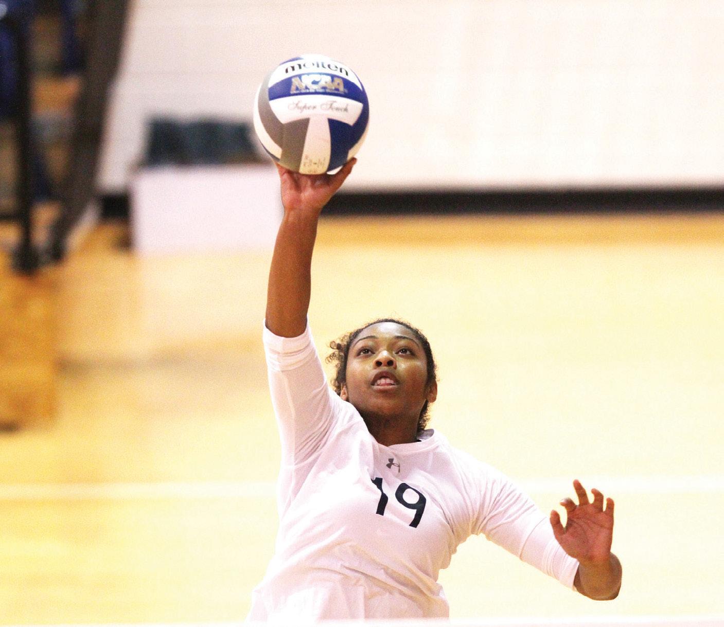 Sophmore Dare Wright leaps into the air to spike the ball against Wartburg during the volleyball tournament hosted at Virginia Wesleyan College.
