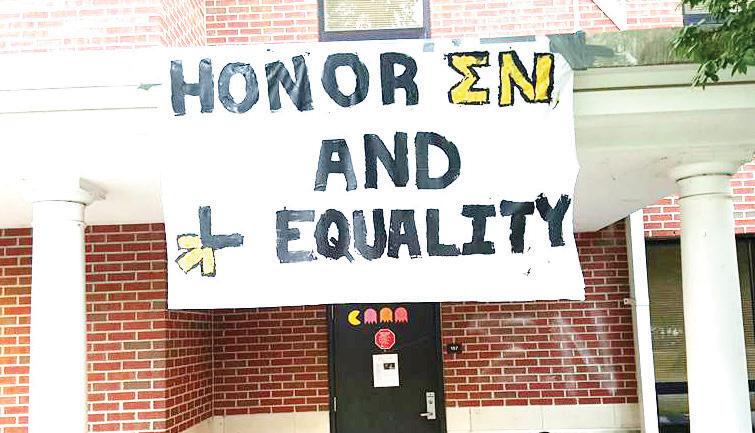 One of the banners hung by the brothers of the Iota Beta chapter of Sigma Nu.